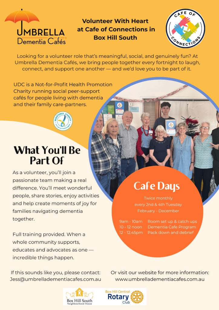 Umbrella Dementia Cafés is looking for fun, motivated and team-oriented volunteers to support our Cafe of Connections dementia cafe in Box Hill South